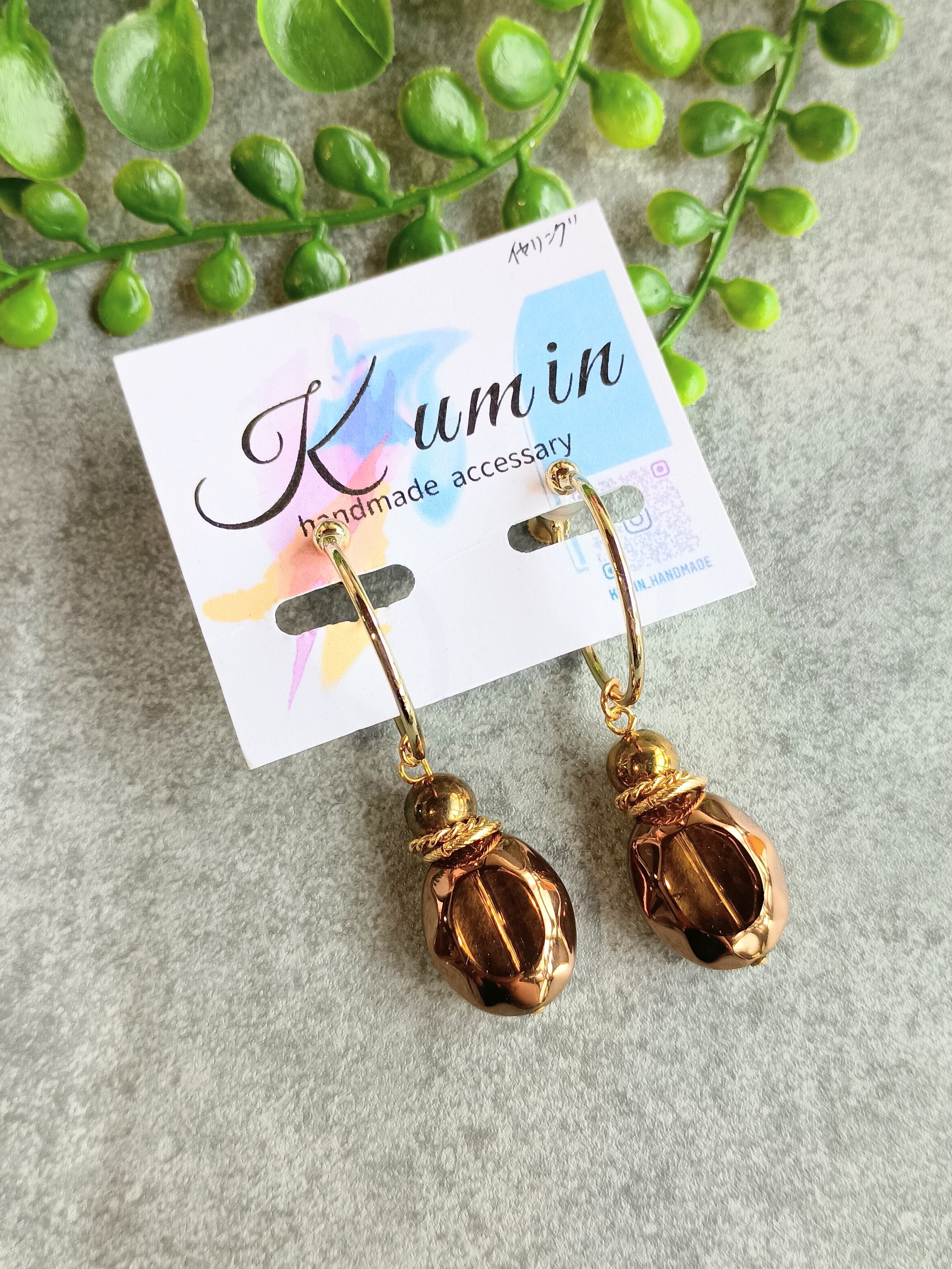 光沢のあるブラウンビーズ×ゴールドのイヤリングです。