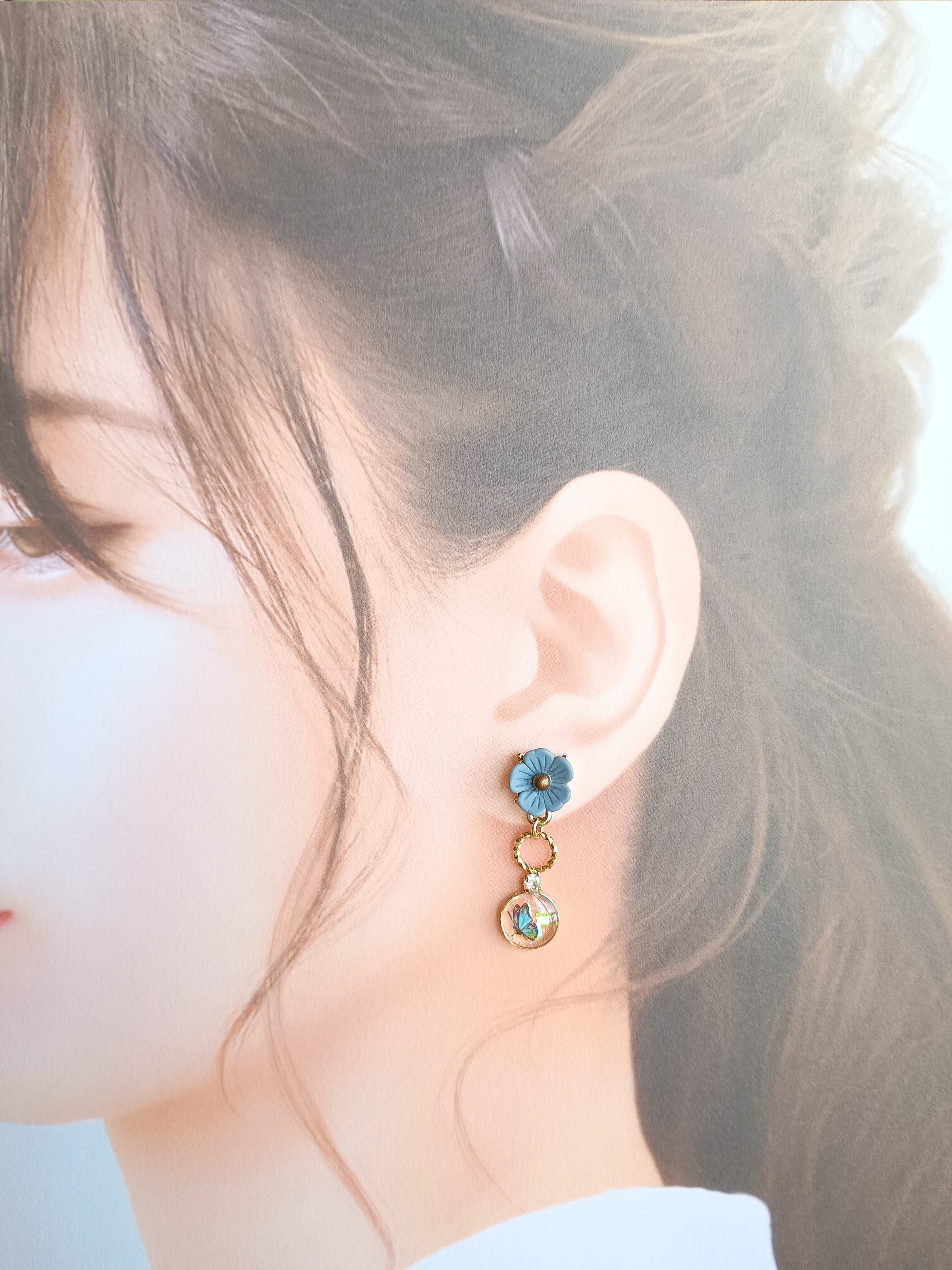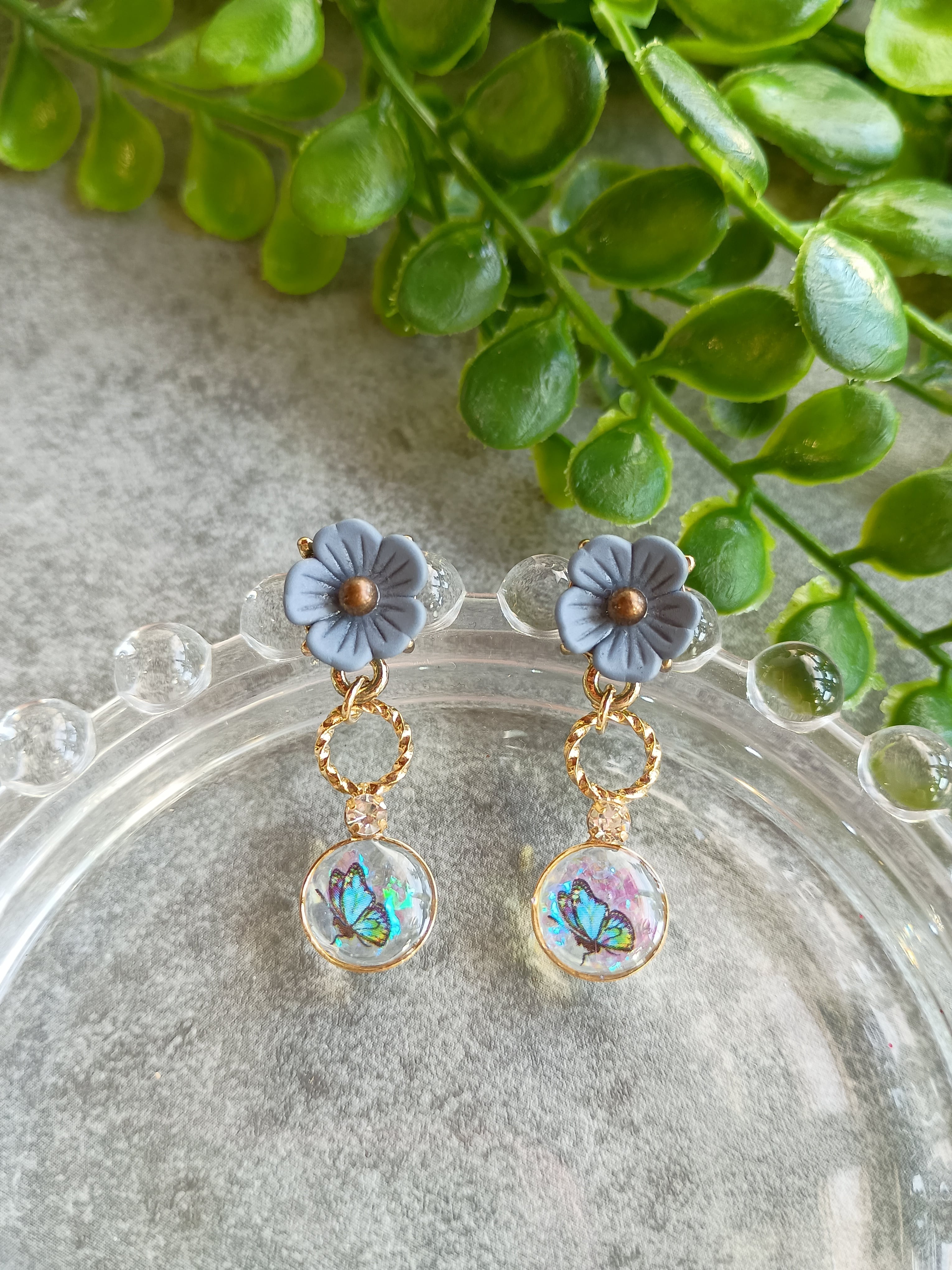 くすみブルーの花に蝶にビーズがついたかわいらしいデザインのピアスです。