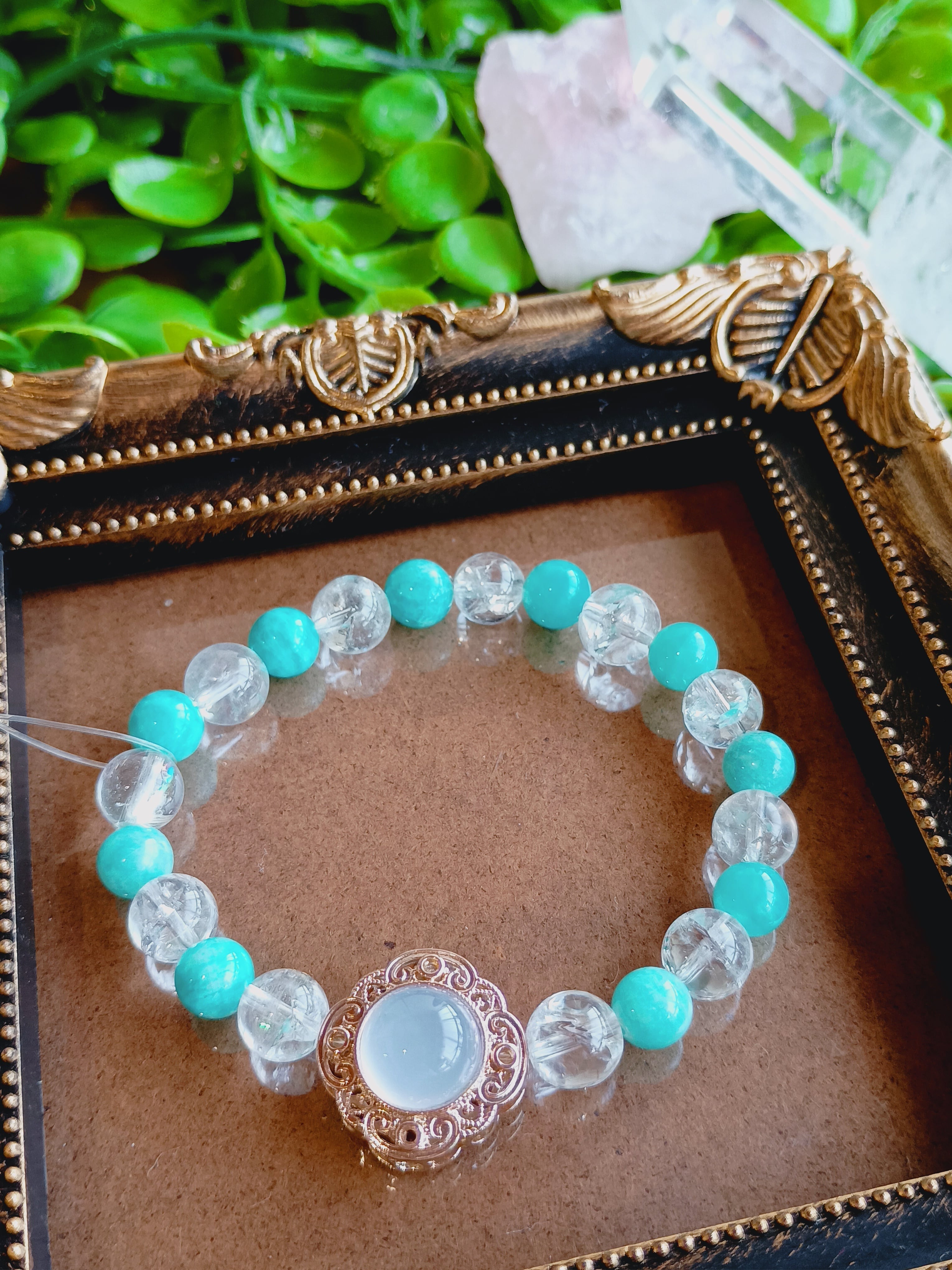 ・カルセドニーの穏やかな色合い、アイリスクォーツの煌めき、アマゾナイトの優しい青が絶妙に調和し、どんなコーディネートにも合いやすいデザインです。