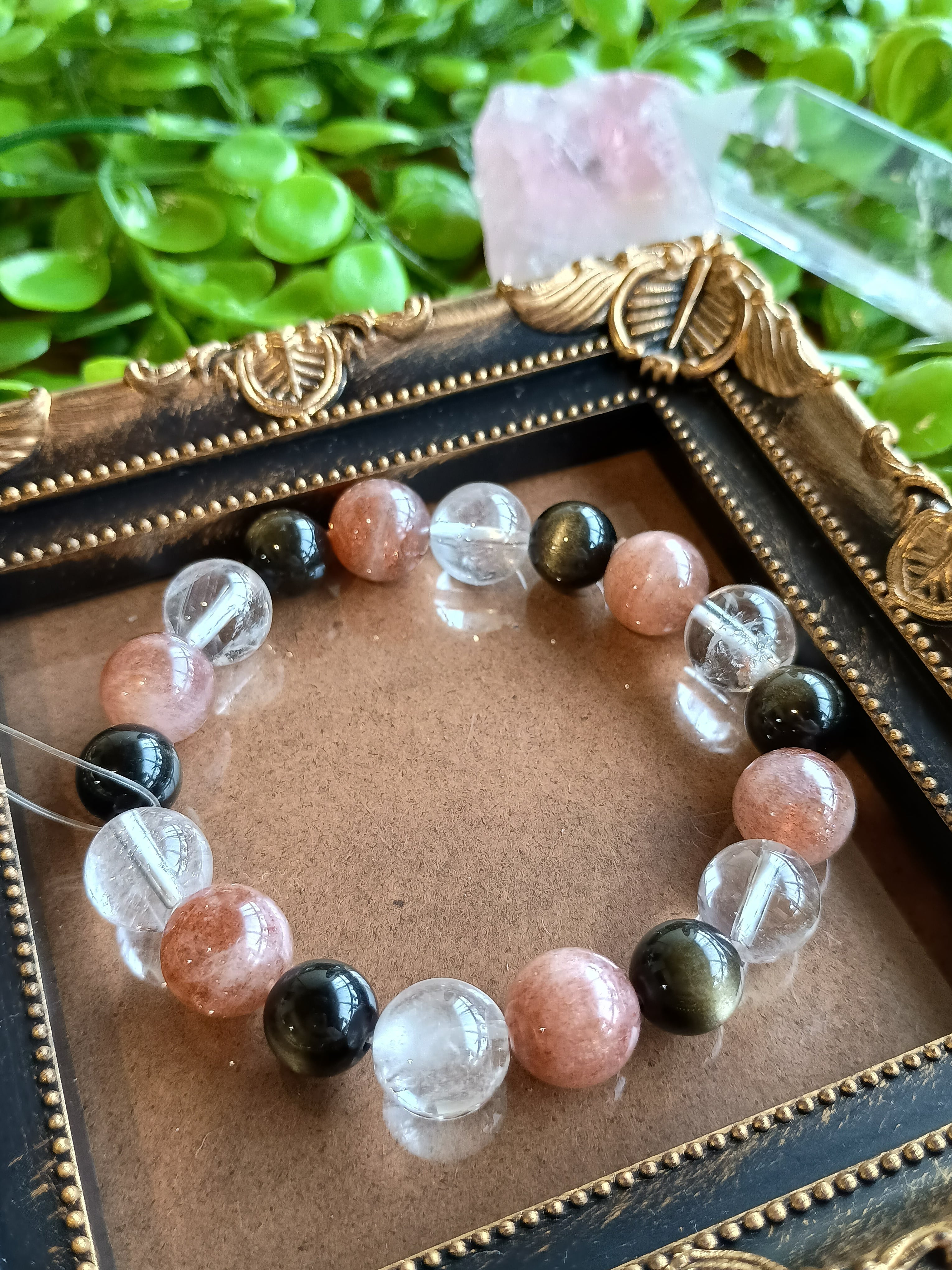 ・ゴールドオブシディアンの神秘的な輝き、サンストーンの温かなオレンジ、アイリスクォーツのキラキラとした透明感が絶妙に調和し、どんなコーディネートにもぴったりのデザインです。